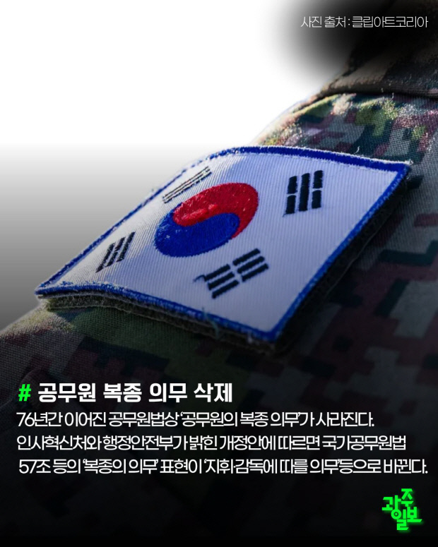 76년간 이어진 공무원법상 ‘공무원의 복종 의무’가 사라진다. 인사혁신처와 행정안전부가 밝힌 개정안에 따르면 국가공무원법 57조 등의 ‘복종의 의무’ 표현이 ‘지휘·감독에 따를 의무’ 등으로 바뀐다.
