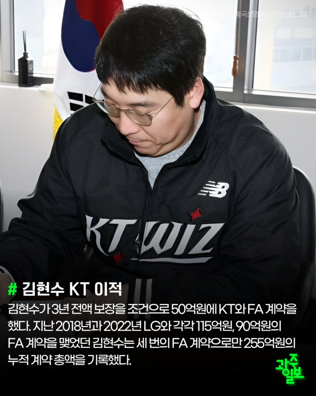 김현수가 3년 전액 보장을 조건으로 50억원에 KT와 FA 계약을 했다. 지난 2018년과 2022년 LG와 각각 115억원, 90억원의 FA 계약을 맺었던 김현수는 세 번의 FA 계약으로만 255억원의 누적 계약 총액을 기록했다.