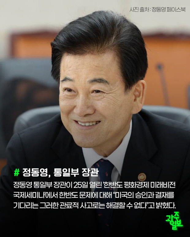 정동영 통일부 장관이 25일 열린 ‘한반도 평화경제 미래비전 국제세미나’에서 한반도 문제에 대해 “미국의 승인과 결재를 기다리는 그러한 관료적 사고로는 해결할 수 없다”고 밝혔다.