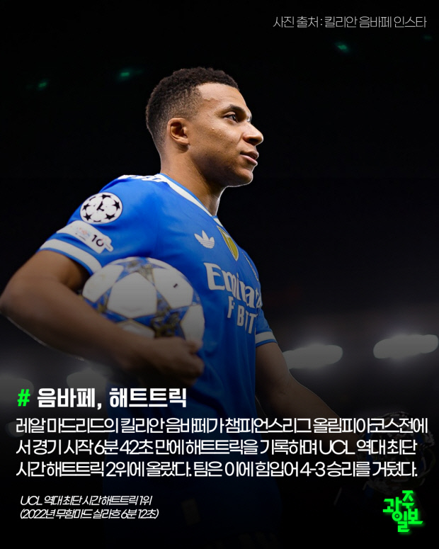 레알 마드리드의 킬리안 음바페가 챔피언스리그 올림피아코스전에서 경기 시작 6분 42초 만에 해트트릭을 기록하며 UCL 역대 최단 시간 해트트릭 2위에 올랐다. 팀은 이에 힘입어 4-3 승리를 거뒀다.