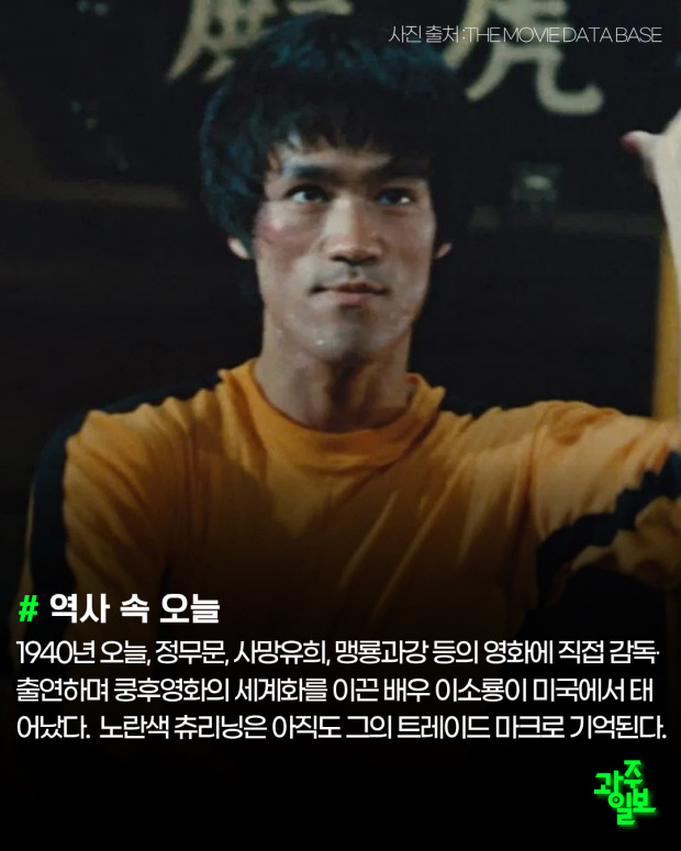 1940년 오늘, 정무문, 사망유희, 맹룡과강 등의 영화에 직접 감독·출연하며 쿵후영화의 세계화를 이끈 배우 이소룡이 미국에서 태어났다. 노란색 츄리닝은 아직도 그의 트레이드 마크로 기억된다.