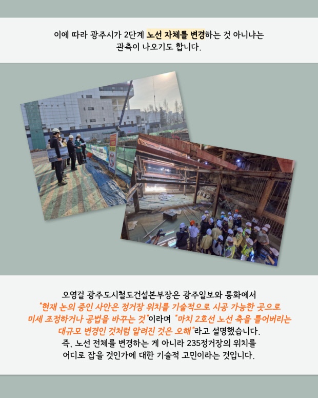 이에 따라 광주시가 2단계 노선 자체를 변경하는 것 아니냐는 관측이 나오기도 하지만, 오영걸 광주도시철도건설본부장은 노선 전체를 변경하는 게 아니라 235정거장의 위치를 어디로 잡을 것인가에 대한 기술적 고민이라고 설명했습니다.