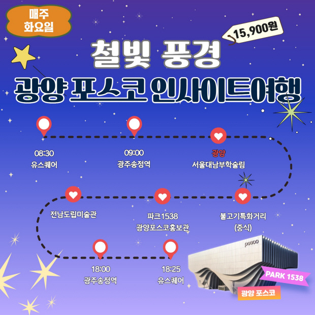 광양시가 12월 2일부터 화요일마다 남도 투어 프로그램 ‘광양 포스코 인사이트 여행’을 운영한다. 주요 코스는 ▲서울대학교 남부연습림 관사 ▲포스코 홍보관 Park 1538 ▲전남도립미술관으로 남도의 역사·산업·예술을 모두 느낄 수 있는 일정이다. 점심식사는 광양 불고기 특화거리에서 하게 된다. 출발지 및 도착지는 광주시 유스퀘어 2번 승차홈과 광주송정역 택시승강장이며 요금은 1인당 1만5900원이다. 예매는 남도한바퀴 누리집·콜센터·카카오톡 채널 등에서 가능하다.