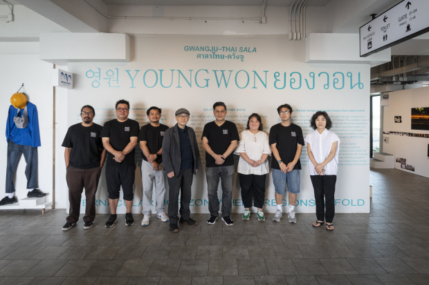 ![]() ‘광주-타이 살라 영원’에 참여한 작가들과 윤범모 대표이사. <광주비엔날레 제공> |