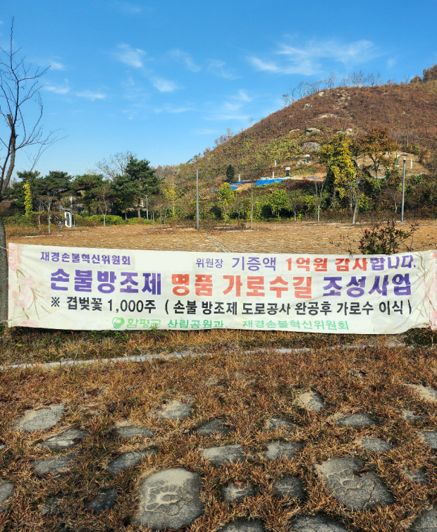 ![]() 함평 신광면 월암리 함평생태공원 인근에 김 씨의 기부를 알리는 현수막이 걸렸다. 현수막이 걸린 도로 건너편 부지에 손불방조제 명품 가로수길 조성사업에 쓸 묘목을 식재했다. |
