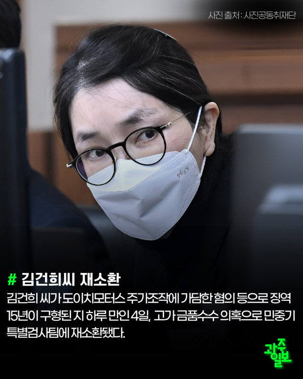 김건희 씨가 도이치모터스 주가조작에 가담한 혐의 등으로 징역 15년이 구형된 지 하루 만인 4일, 고가 금품수수 의혹으로 민중기 특별검사팀에 재소환됐다.
