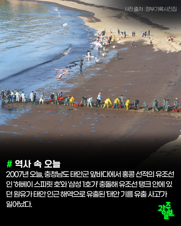 2007년 오늘, 충청남도 태안군 앞바다에서 홍콩 선적의 유조선인 ‘허베이 스피릿 호’와 ‘삼성 1호가’ 충돌해 유조선 탱크 안에 있던 원유가 태안 인근 해역으로 유출된 ‘태안 기름 유출 사고’가 일어났다.