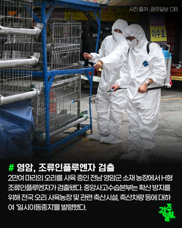 2만여 마리의 오리를 사육 중인 전남 영암군 소재 농장에서 H형 조류인플루엔자가 검출됐다. 중앙사고수습본부는 확산 방지를 위해 전국 오리 사육농장 및 관련 축산시설, 축산차량 등에 대하여 ‘일시이동중지’를 발령했다.