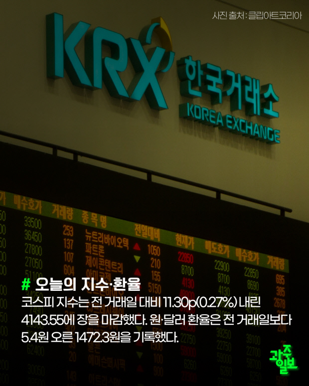 코스피 지수는 전 거래일 대비 11.30p(0.27%) 내린 4143.55에 장을 마감했다. 원·달러 환율은 전 거래일보다 5.4원 오른 1472.3원을 기록했다.