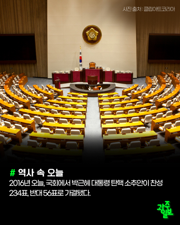 2016년 오늘, 국회에서 박근혜 대통령 탄핵 소추안이 찬성 234표, 반대 56표로 가결됐다.