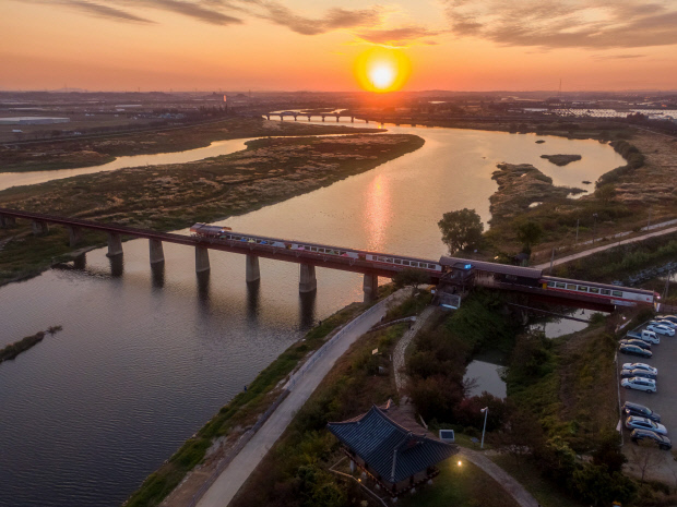 ![]() 비비정에서 바라본 옛 철길에 놓인 예술 열차가 석양 속 한 폭의 동양화를 연출하고 있다. <완주군 제공> |