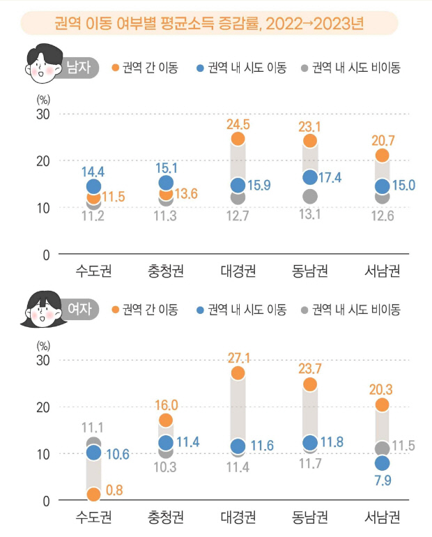 남성의 경우 수도권에서 일자리를 잡으면서 타권역보다 소득이 크게 올랐다.