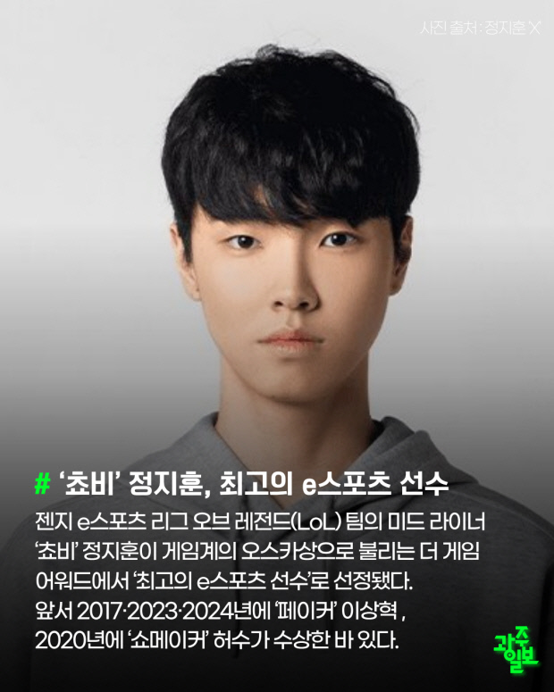 젠지 e스포츠 리그 오브 레전드(LoL) 팀의 미드 라이너 ‘쵸비’ 정지훈이 게임계의 오스카상으로 불리는 더 게임 어워드에서 ‘최고의 e스포츠 선수’로 선정됐다. 앞서 2017·2023·2024년에 ‘페이커’ 이상혁 , 2020년에 ‘쇼메이커’ 허수가 수상한 바 있다.