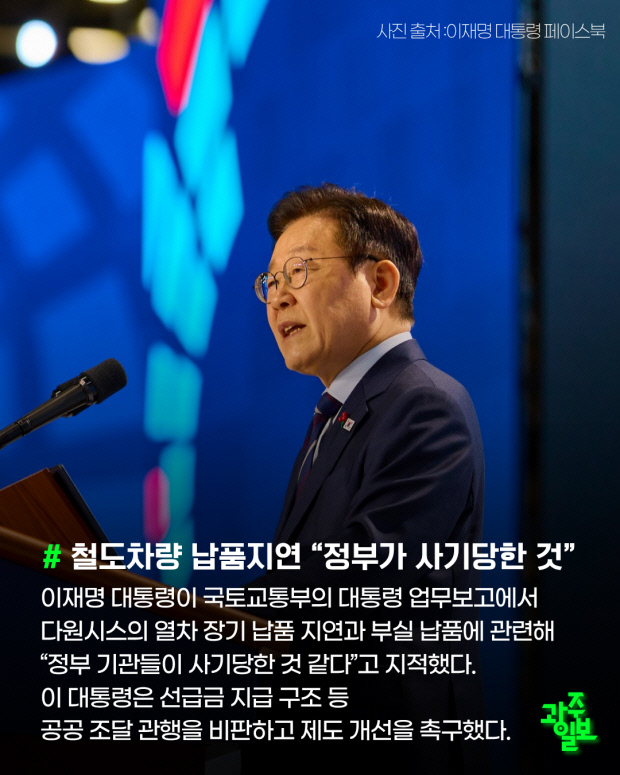 이재명 대통령이 국토교통부의 대통령 업무보고에서 다원시스의 열차 장기 납품 지연과 부실 납품에 관련해 “정부 기관들이 사기당한 것 같다”고 지적했다. 이 대통령은 선급금 지급 구조 등 공공 조달 관행을 비판하고 제도 개선을 촉구했다.