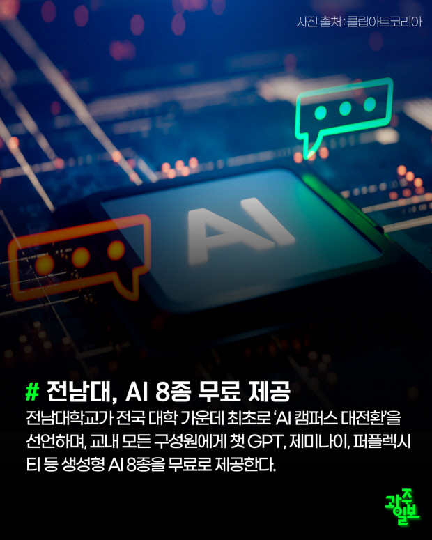 전남대학교가 전국 대학 가운데 최초로 ‘AI 캠퍼스 대전환’을 선언하며, 교내 모든 구성원에게 챗 GPT, 제미나이, 퍼플렉시티 등 생성형 AI 8종을 무료로 제공한다.