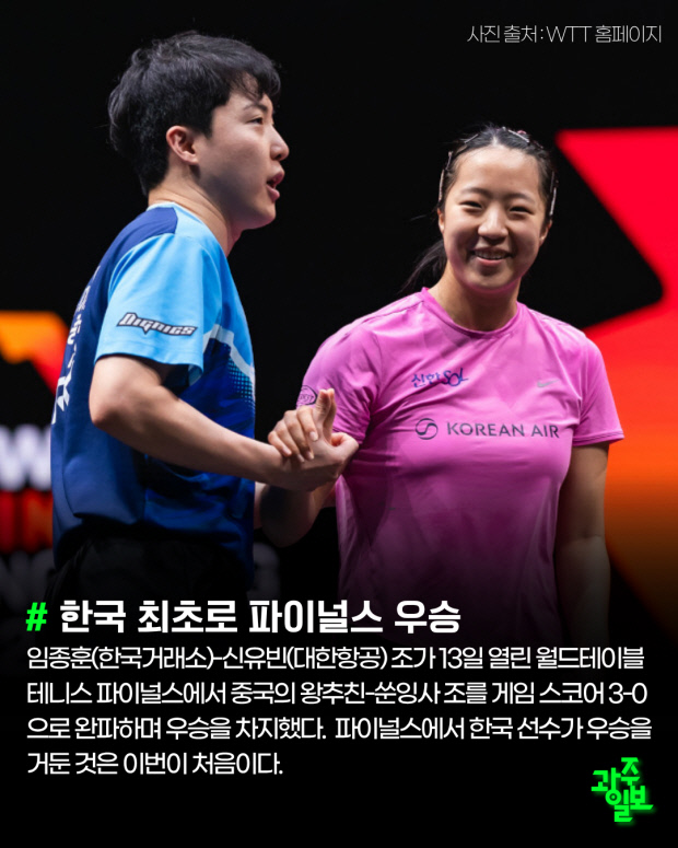 임종훈(한국거래소)-신유빈(대한항공) 조가 13일 열린 월드테이블테니스 파이널스에서 중국의 왕추친-쑨잉사 조를 게임 스코어 3-0으로 완파하며 우승을 차지했다. 파이널스에서 한국 선수가 우승을 거둔 것은 이번이 처음이다.