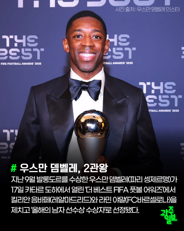 지난 9월 발롱도르를 수상한 우스만 뎀벨레(파리 셍제르맹)가 17일 카타르 도하에서 열린 ‘더 베스트 FIFA 풋볼 어워즈’에서 킬리안 음바페(레알마드리드)와 라민 야말(FC바르셀로나)을 제치고 ‘올해의 남자 선수상 수상자’로 선정됐다.