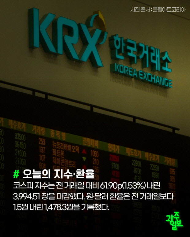 코스피 지수는 전 거래일 대비 61.90p(1.53%) 내린 3,994.51 장을 마감했다. 원·달러 환율은 전 거래일보다 1.5원 내린 1,478.3원을 기록했다.