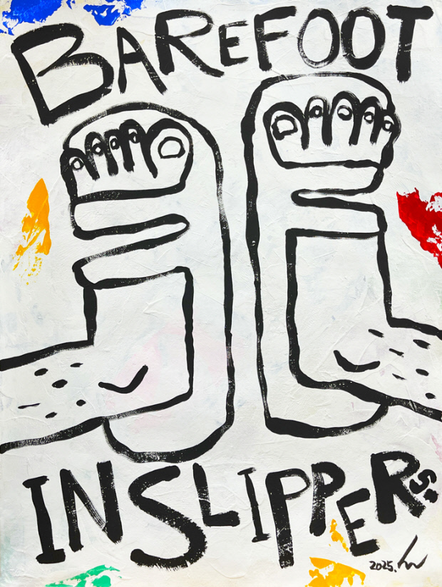만화 속 캐릭터를 옮겨온 듯 한 ‘맨발의 슬리퍼’는 발가락이 웃는 얼굴로 형상화돼 있는 보는 이에게 미소를 짓게 한다. 슬리퍼가 주인공인지 10개의 발가락이 주인공인지 알 수 없지만 보는 이에 따라 두 개가 모두 주인공으로 초점화된다.