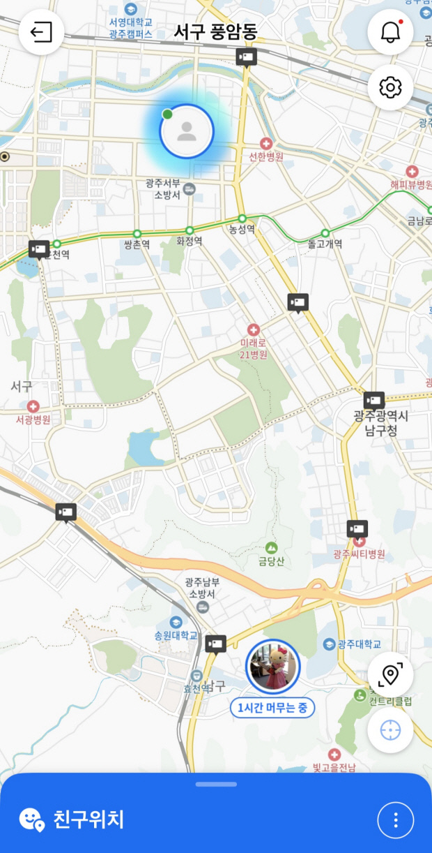 ![]() 카카오 ‘친구 위치’ 공유 화면. <카카오맵 캡처> |