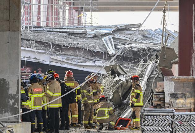 ![]() 광주대표도서관 붕괴사고 당시 119 구조대원들이 수색 및 구조 방안을 논의하고 있는 모습. <광주일보 자료사진> |