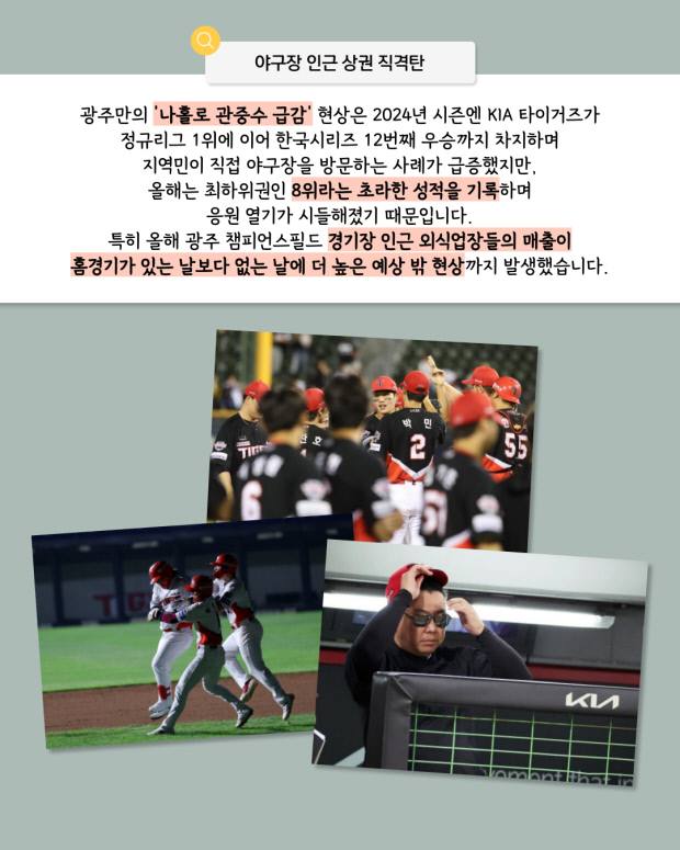 특히 올해 광주 챔피언스필드 경기장 인근 외식업장들의 매출은 홈경기가 있는 날보다 없는 날에 더 높은 예상 밖 현상까지 발생했습니다.