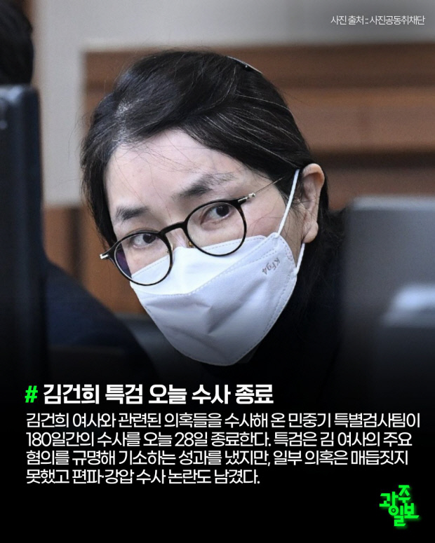 김건희 여사와 관련된 의혹들을 수사해 온 민중기 특별검사팀이 180일간의 수사를 오늘 28일 종료한다. 특검은 김 여사의 주요 혐의를 규명해 기소하는 성과를 냈지만, 일부 의혹은 매듭짓지 못했고 편파·강압 수사 논란도 남겼다.