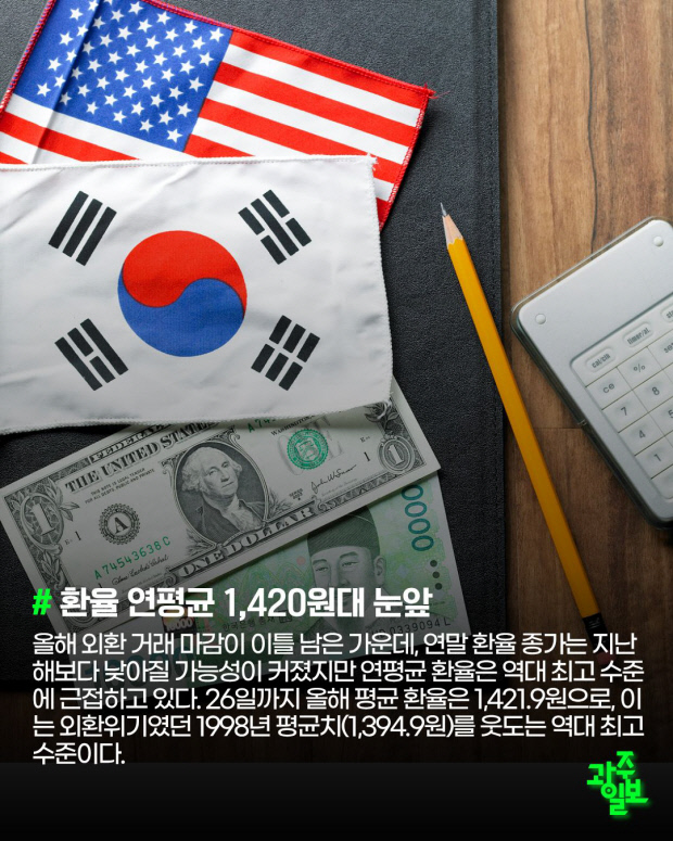 올해 외환 거래 마감이 이틀 남은 가운데, 연말 환율 종가는 지난해보다 낮아질 가능성이 커졌지만 연평균 환율은 역대 최고 수준에 근접하고 있다. 26일까지 올해 평균 환율은 1,421.9원으로, 이는 외환위기였던 1998년 평균치(1,394.9원)를 웃도는 역대 최고 수준이다.