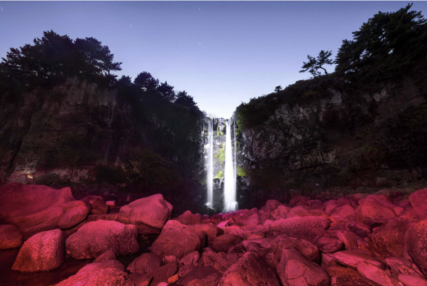 ‘제주4·3학살터 정방폭포’는 아름다운 자연 이면에 드리워진 현대사의 굴곡을 환기한다. 어스름이 내리는 시간 하얗게 쏟아지는 폭포, 감청색의 하늘, 불그스름한 빛의 돌들은 각기 살아있는 생명처럼 다가온다. 아름다운 풍경 이면에 감춰진 학살의 역사를 작가는 특유의 은유적인 방식으로 초점화한다.