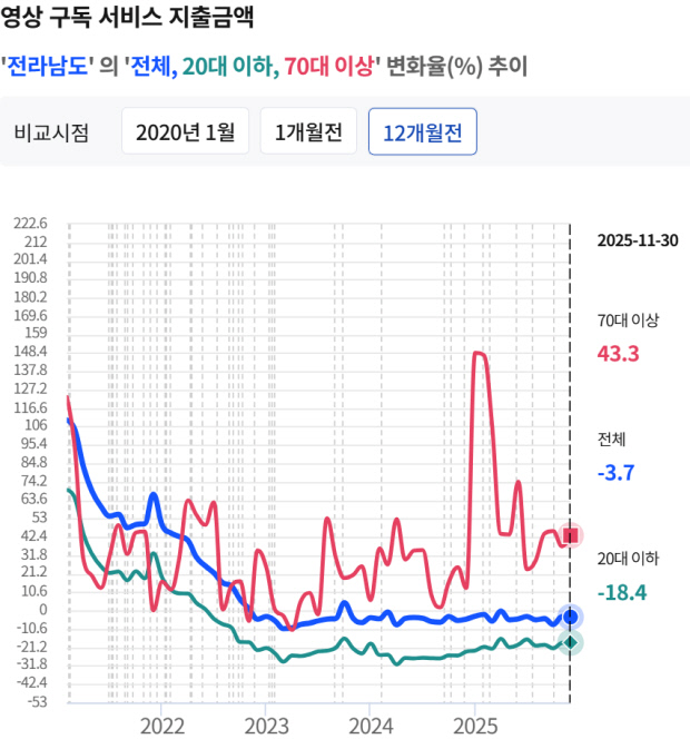 연말 들어 광주 지역민의 영상 구독 서비스(OTT) 지출금액이 20대 이하부터 40대까지는 1년 전보다 줄었지만 50~70대 이상은 증가한 것으로 나타났다.