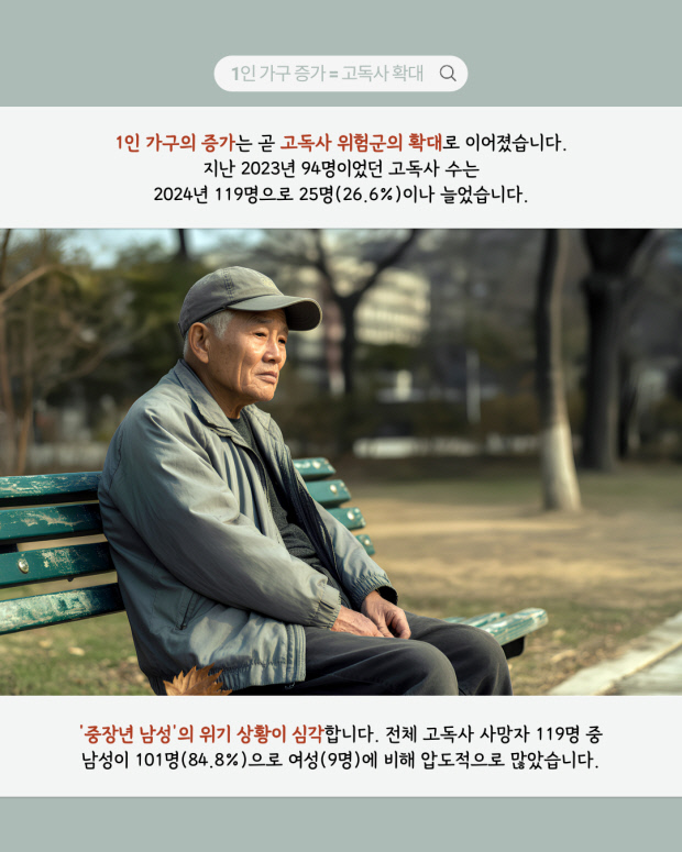 1인 가구의 증가는 곧 고독사 위험군의 확대로 이어졌습니다. 지난 2023년 94명이었던 고독사 수는 2024년 119명으로 25명(26.6%)이나 늘었습니다.