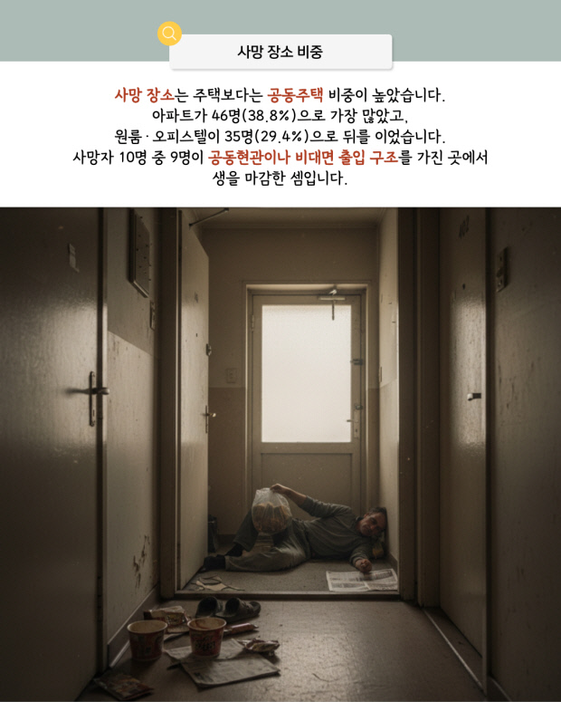 사망 장소는 주택보다는 공동주택 비중이 높았습니다. 아파트가 46명(38.8%)으로 가장 많았고, 원룸·오피스텔이 35명(29.4%)으로 뒤를 이었습니다.