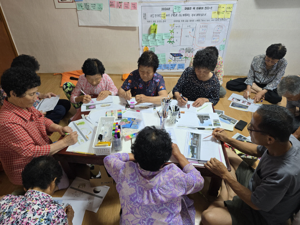 ![]() 금강마을 주민들이 마을지도에 사용할 그림을 그리고 있다.