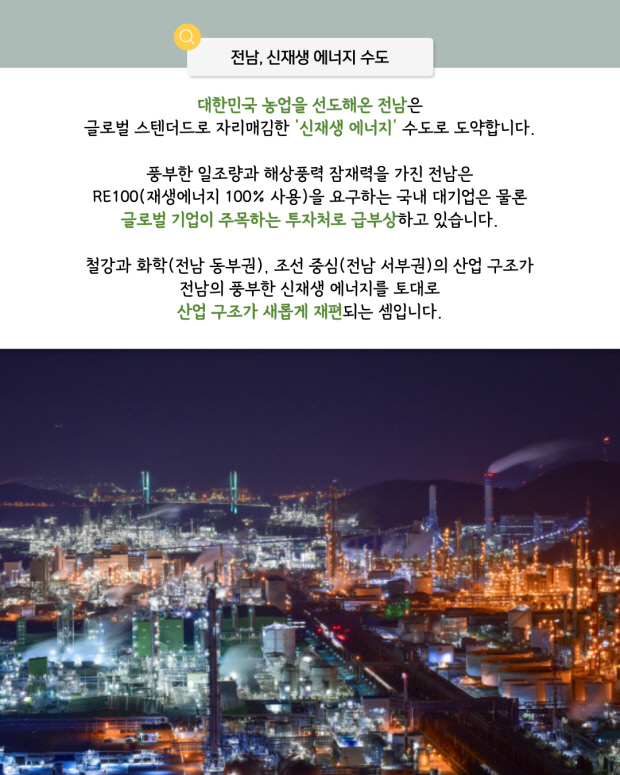 풍부한 일조량과 해상풍력 잠재력을 가진 전남은 RE100(재생에너지 100% 사용)을 요구하는 국내 대기업은 물론 글로벌 기업이 주목하는 투자처로 급부상하고 있습니다.