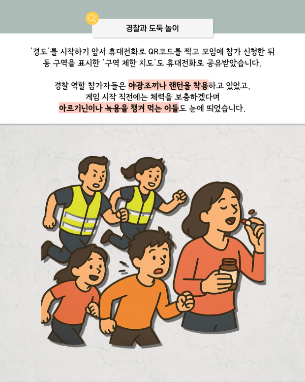 경찰 역할 참가자들은 야광조끼나 랜턴을 착용하고 있었고, 게임 시작 직전에는 체력을 보충하겠다며 아르기닌이나 녹용을 챙겨 먹는 이들도 눈에 띄었습니다.