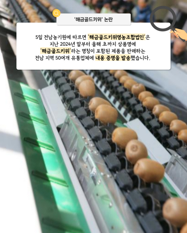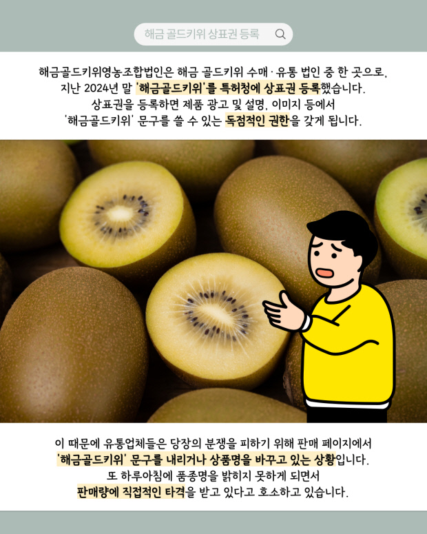 ‘골드키위’는 키위 종류를 뜻하는 보통명칭이고, ‘해금’은 품종 등록된 명칭이어서 이를 결합한 ‘해금 골드키위’는 특정 브랜드라기보다 “해금 품종의 골드키위”라는 상품 설명에 불과하다는 법률 자문도 받았습니다.