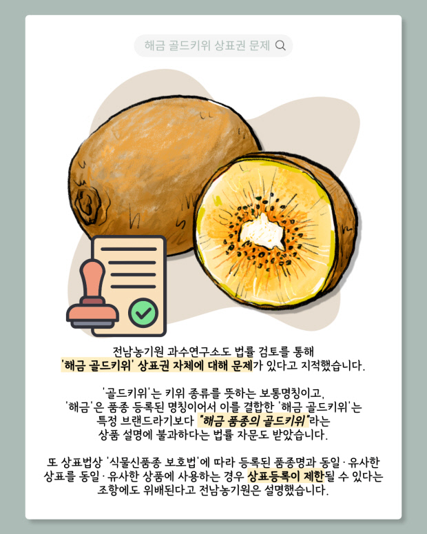 전남농기원 과수연구소도 법률 검토를 통해 ‘해금 골드키위’ 상표권 자체에 대해 문제가 있다고 지적했습니다.
