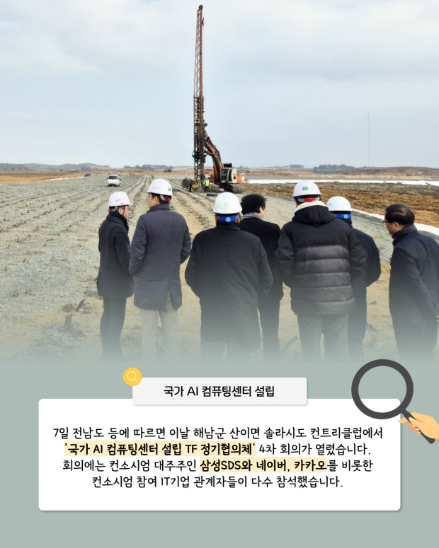 7일 전남도 등에 따르면 이날 해남군 산이면 솔라시도 컨트리클럽에서 ‘국가 AI 컴퓨팅센터 설립 TF 정기협의체’ 4차 회의가 열렸습니다. 회의에는 컨소시엄 대주주인 삼성SDS와 네이버, 카카오를 비롯한 컨소시엄 참여 IT기업 관계자들이 다수 참석했습니다.