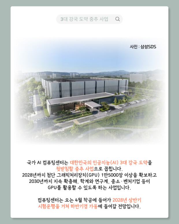 국가 AI 컴퓨팅센터는 대한민국의 인공지능(AI) 3대 강국 도약을 뒷받침할 중추 사업으로 꼽힙니다. 2028년까지 첨단 그래픽처리장치(GPU) 1만5000장 이상을 확보하고 2030년까지 지속 확충해, 학계와 연구계, 중소·벤처기업 등이 GPU를 활용할 수 있도록 하는 사업입니다.