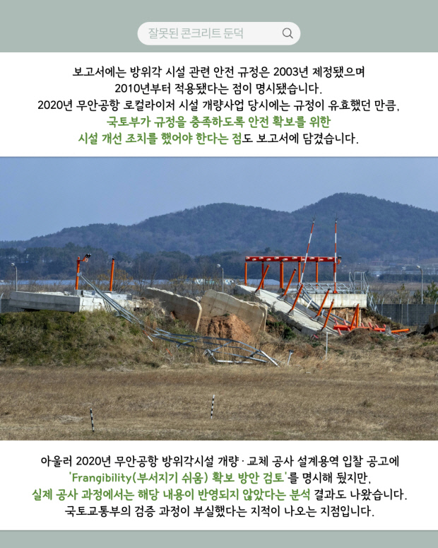 아울러 2020년 무안공항 방위각시설 개량·교체 공사 설계용역 입찰 공고에 ‘Frangibility(부서지기 쉬움) 확보 방안 검토’를 명시해 뒀지만, 실제 공사 과정에서는 해당 내용이 반영되지 않았다는 분석 결과도 나왔습니다. 국토교통부의 검증 과정이 부실했다는 지적이 나오는 지점입니다.