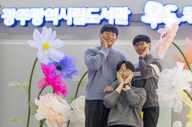 광주광역시립무등도서관 1층 로비에서 정태양(왼쪽부터), 공근영, 백영학 사서가 포즈를 취하고 있다./김진수 기자 jeans@kwangju.co.kr