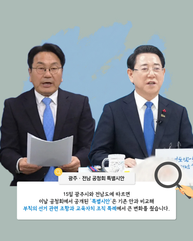 광주시와 전남도는 15일 열린 공청회에서 ‘특별시안’을 공개했다. 이번 안은 기존 법안과 비교해 선거 관련 조항과 교육자치 특례에서 큰 변화를 담았다.