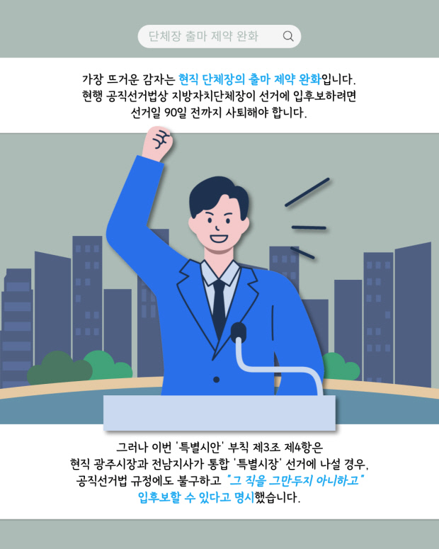 가장 주목되는 부분은 현직 단체장의 출마 제약 완화다. 현행 공직선거법은 지방자치단체장이 선거에 출마하려면 선거일 90일 전 사퇴해야 하지만, 특별시안 부칙 제3조 제4항은 광주시장과 전남지사가 통합 ‘특별시장’ 선거에 나설 경우 직을 유지한 채 입후보할 수 있도록 규정했다.