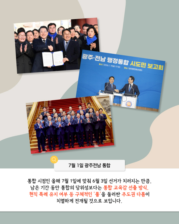 또 다른 쟁점은 통합 교육감 선출이다. 특별법안은 광주·전남 교육청을 통합하고, 오는 6·3 지방선거에서 ‘특별시 교육감’을 선출하도록 규정하고있다. 별도의 경과조치 없이 단수 교육감을 뽑는 것으로 명시돼 있어 사실상 이번 선거부터 통합 교육감 1명을 선출하는 방향으로 가닥이 잡혔다.