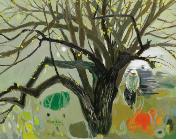 신동언의 ‘봄나들이’는 한겨울 속 봄 기운을 만끽할 수 있는 작품이다. 메마른 가지에 한 잎, 두 잎 피어나기 시작한 노오란 꽃잎과 소담한 시골의 풍경이 따사로운 봄의 정취를 느끼게 한다. 겨울을 저만치 밀어내고 찾아온 봄을 만끽하려 길을 나선 촌부의 모습이 미소를 짓게 한다.