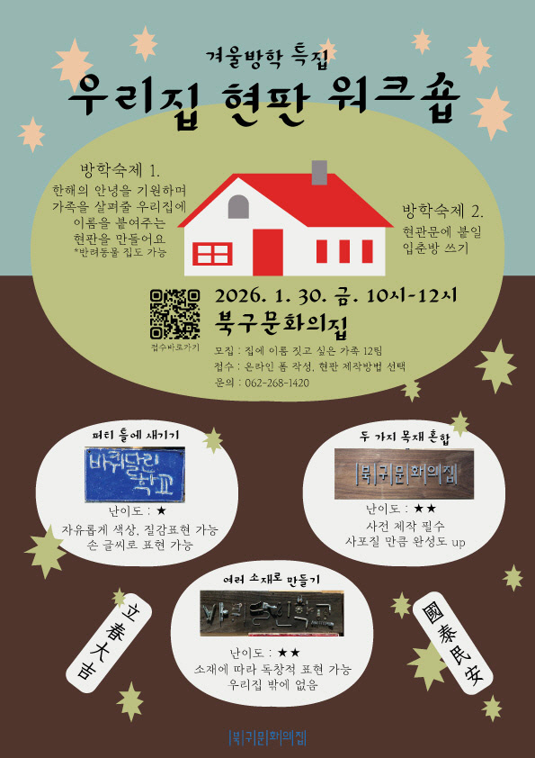 겨울방학 특집 프로그램 ‘우리집 현판 워크숍’이 오는 30일 오전 10시 북구청소년수련관 별관 2층 북구문화의집에서 열린다. 이번 프로그램은 가족의 뜻과 바람을 담은 문구나 이름을 정해 직접 현판을 만들어보는 체험형 워크숍이다.