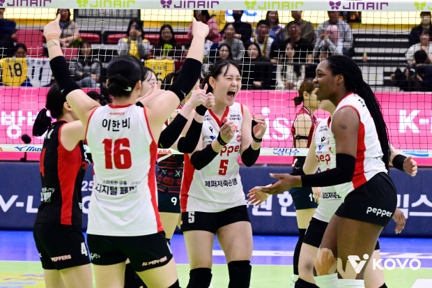 페퍼저축은행 AI페퍼스가 지난달 9일 수원체육관에서 열린 진에어 2025-2026 V리그 여자부 3라운드 현대건설 힐스테이트와의 경기에서 득점에 성공한 뒤 기뻐하고 있다. <KOVO 제공>