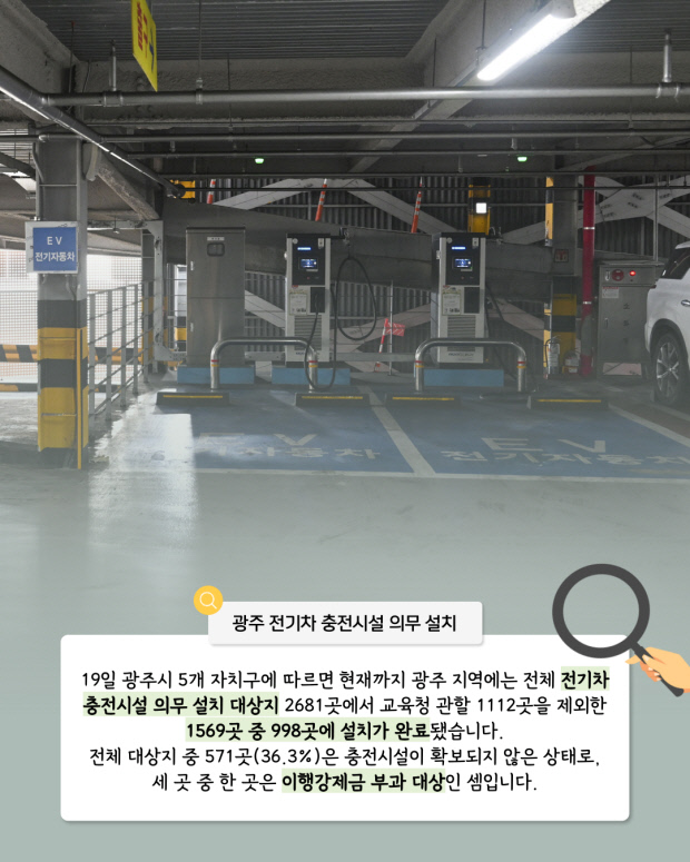 광주 전체 대상지 2681곳 중 998곳만 설치가 완료됐고, 571곳(36.3%)은 충전시설이 확보되지 않은 상태로 기한 이후 이행강제금(기기당 20~50만원) 부과 대상이 된다.