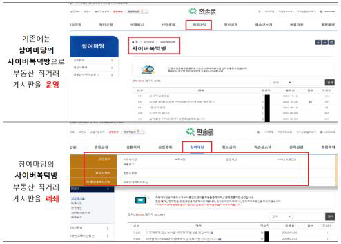 ![]() 화순군청 부동산 직거래 게시판 운영 중단 전후 사이트 모습. <한국공인중개사협회 제공> |
