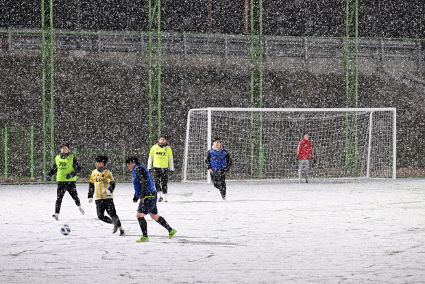 ![]() 매서운 한파에 폭설이 내린 21일 오후 광주시 남구 다목적 축구장에서 동호인들이 축구경기를 즐기고 있다.
